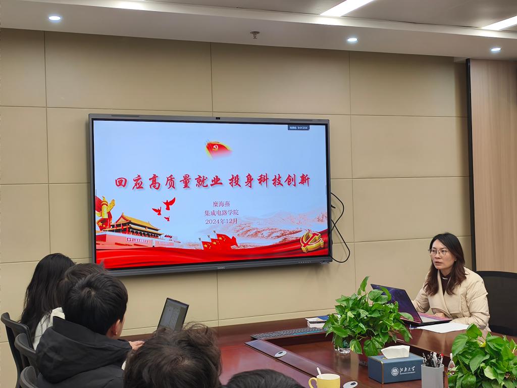 上海大学微电子公司电子信息研究生党支部潘金文同志随后带领大家学习了中央经济工作会议精神。她详细解读了2024年经济工作的总结、当前经济形势的分析以及2025年经济工作的部署。会上就2025年九大工作任务进行了学习,特别是以科技创新引领新质生产力发展方面的举措进行了深入学习和交流。