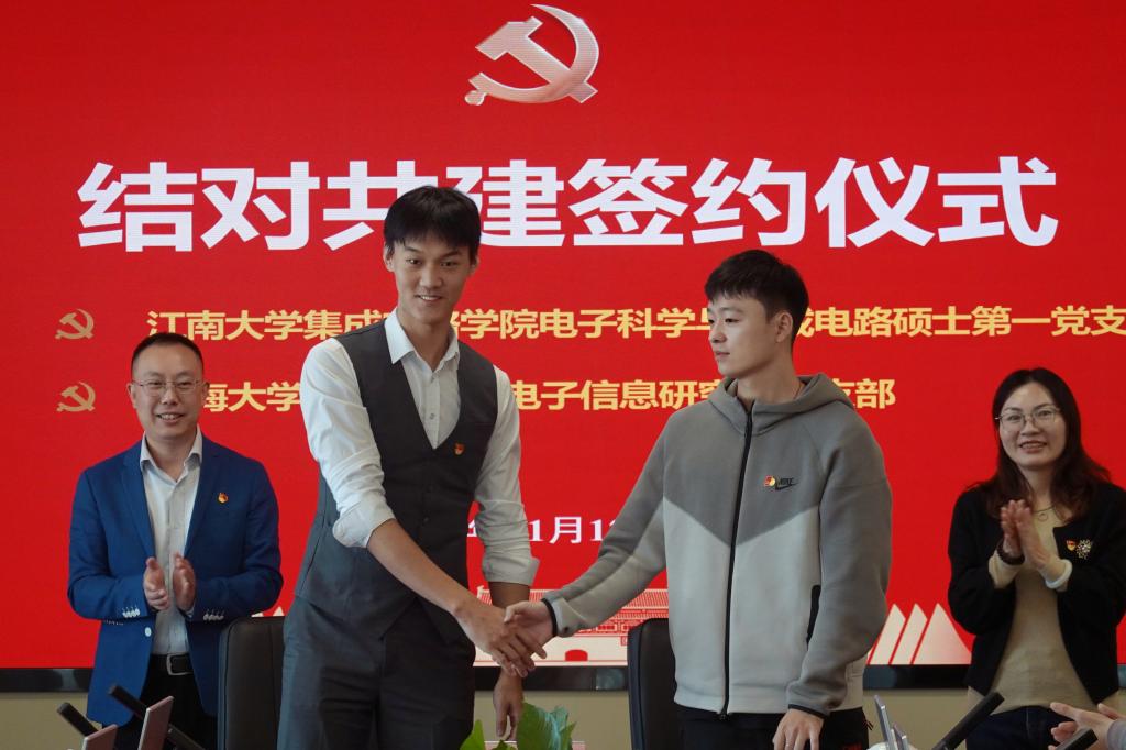 上午,william威廉中文官网电子科学与集成电路硕士第一党支部书记胡浩宇与上海大学微电子公司电子信息研究生党支部书记俞浩在霞客湾校区行政楼304会议室共同签署结对共建协议,糜海燕、袁铭见证签约。此次结对共建是实现资源共享、互学互鉴、共同提高的重要举措,标志着两院在携手并进、共创未来的道路上迈出了坚实的一步。