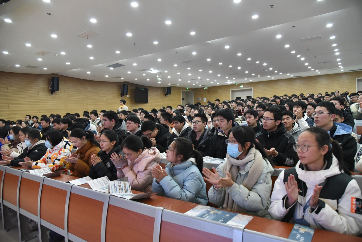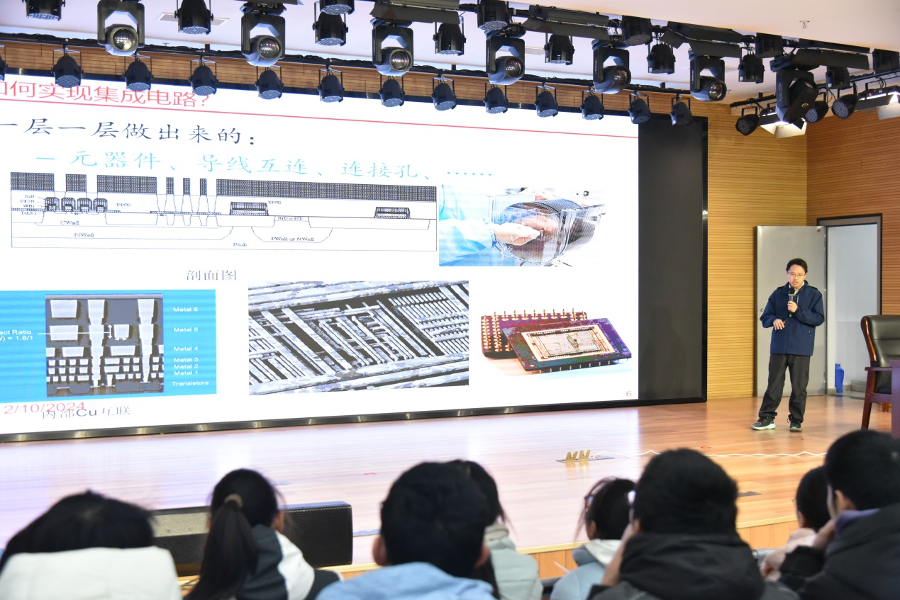 签约仪式后,虞致国教授为高三物化选科员工作《智能时代的基石——高算力芯片的前世今生》科普讲座。虞教授从集成电路产业“卡脖子”难题入手,结合高三员工学习的电学知识,通俗易懂地介绍了集成电路的组成、摩尔定律、AI芯片等知识,向高三同学打开了智能时代“芯片之门”,激发了员工的专业学习兴趣。