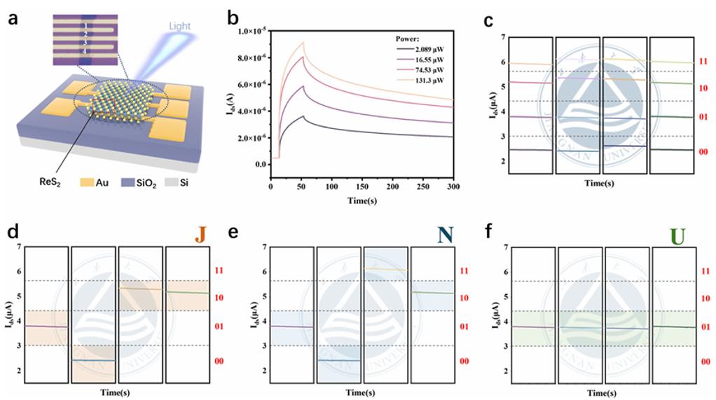 光电混合通信应用:ReS₂阵列对“J”“N”“U”ASCII码编码实现及光信号转换