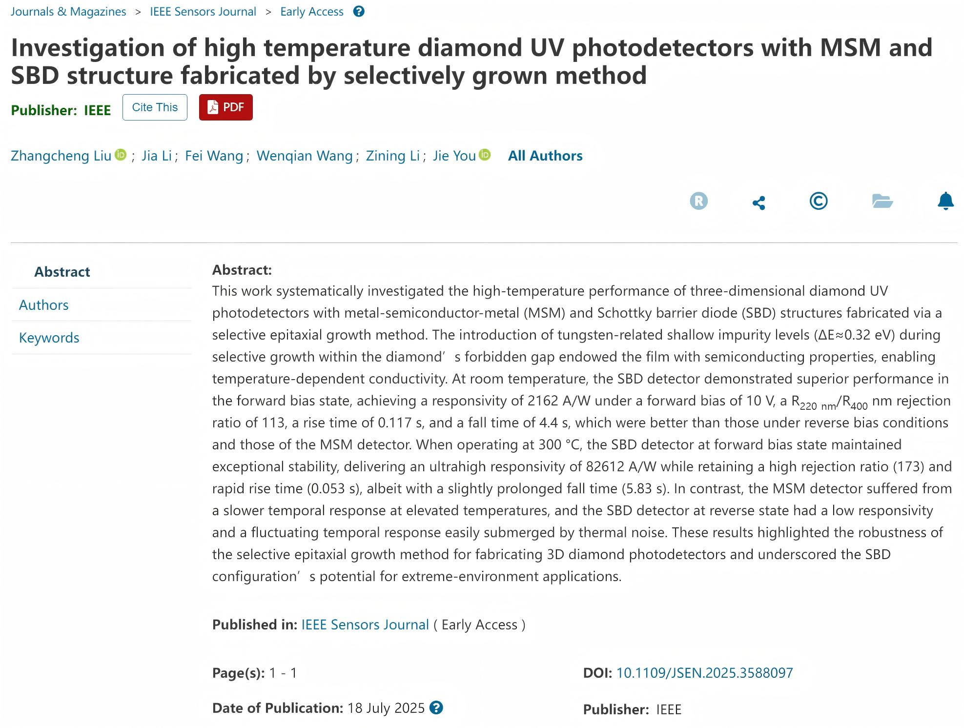 李佳同学的论文题目为“Investigation of High-Temperature Diamond UV Photodetectors With MSM and SBD Structure Fabricated by Selectively Grown Method”(DOI: 10.1109/JSEN.2025.3588097)。传统硅基紫外探测器受窄带隙的限制,高温下光信号检测能力较弱,相比之下,金刚石则凭借超宽带隙、优异的导热性以及出色的抗辐射能力,成为高温紫外探测的理想选择。该论文对选择性外延制备的3D MSM和SBD结构金刚石紫外探测器进行了系统的高温性能表征,发现正向偏置的SBD探测器在高温环境下展现出最优性能组合:高响应度、高紫外/可见抑制比及快响应速度,表明肖特基势垒设计既能有效抑制缺陷相关响应,又可维持高效载流子输运。此外,选择性外延生长法确保了电极-金刚石界面的高温稳定性,MSM结构的欧姆接触与SBD结构的整流特性在高温下均得以保持。这些结果充分证明了选择性外延3D金刚石探测器在极端环境应用的可行性。该研究得到了国家重点研发计划(2024YFE0205100)、江苏省重点研发计划(BE2023007-1、BG2024019)、中央高校基本科研业务费专项资金(JUSRP202501020、JUSRP202501032)、重庆市科技创新重点研发计划(CSTB2024TIAD-STX0007)的资助。