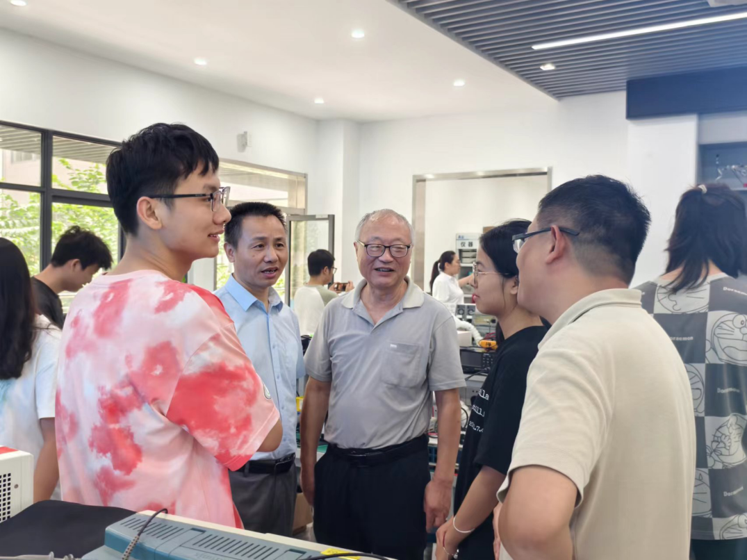 在老员工创新实践基地,大家走进电子设计俱乐部,现场观摩了电子设计竞赛校内模拟赛,与竞赛指导老师、备赛员工深入交流。耿向阳对暑期坚守在一线的指导老师表示感谢,希望同学们全力备赛,进一步夯实理论素养,提高实践能力,不断追求创新,争取在比赛中取得优异成绩。