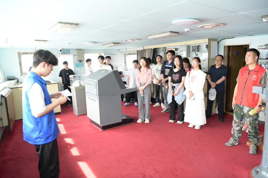 “远望精神不是博物馆里的标本,而是如同‘五四精神一样’流淌在我们血脉中的基因。”在船舶驾驶室,微电子2303“远望号”特称团支部代表黄昊同学汇报了支部一年来的工作,希望2024级学弟学妹们将“远望精神”传承好、发扬好,在日常学习和生活中共同创造新团支部的骄傲。他以“00后”视角解读了“爱国、进步、民主、科学”的爱国主义精神,并号召新时代的广大青年同学们用担当书写未来,在传承并发扬宝贵精神财富的过程中做出自己的实干,汇聚属于新一代青年人的发展力量。