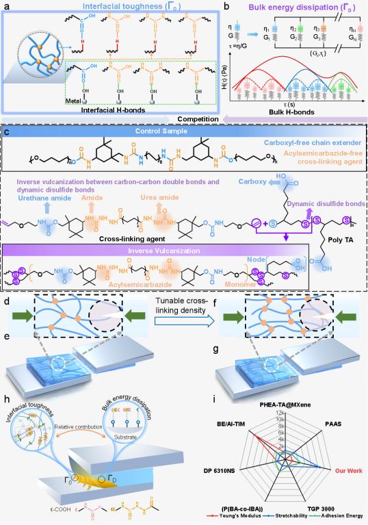研究团队在PU-TA弹性体中引入脲酰胺、尿素酰胺、酰胺和羧基等多重氢键供受体。其中,界面氢键增强基板连接(图1a),本体氢键通过动态断裂与重组耗散能量(图1b)。通过调节扩链剂与交联剂比例,可精准调控交联密度。当交联密度为17.9×1024m-3时,材料在拉伸测试中形成显著的裂纹尖端过程区(图1d-g),并呈现内聚失效模式。其粘接性能远超脊椎皮肤(柔韧性相当)和壁虎脚(粘接能高340倍),优于现有商业粘合剂(图1i)。