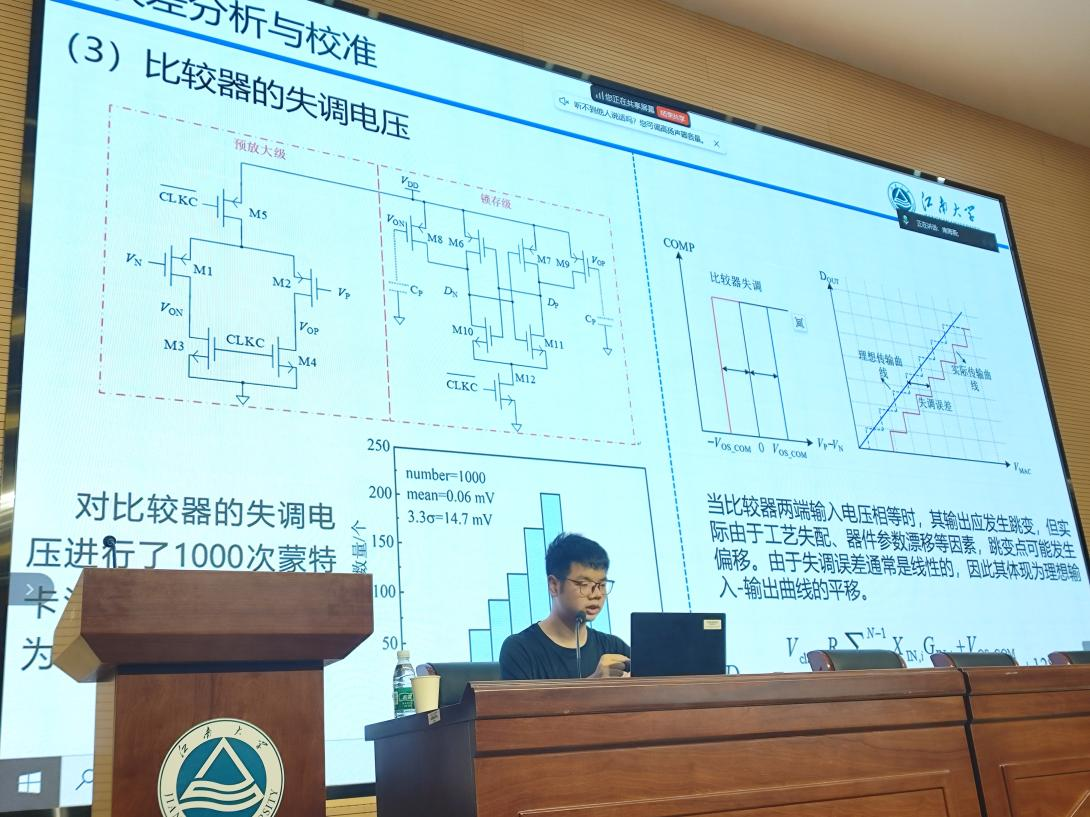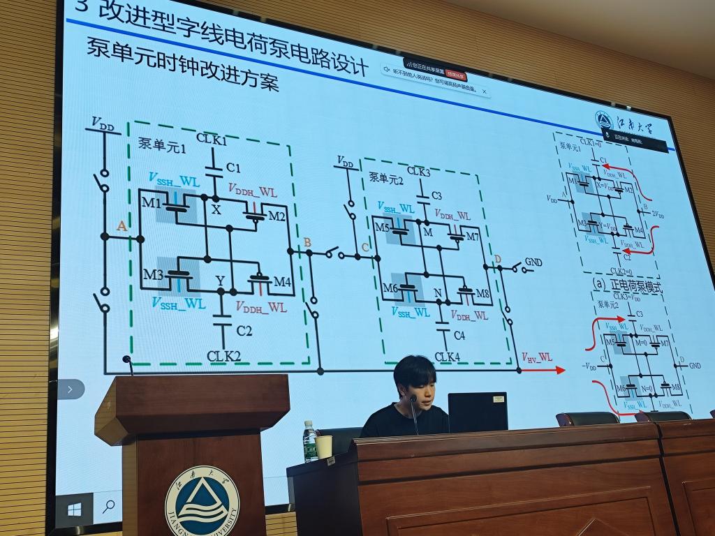 林郑源围绕《基于Flash器件存算一体阵列的字线电荷泵电路研究与设计》主题,详细介绍了通过优化电荷泵电路架构实现单一电荷泵电路产生多模式字线电压的研究思路。他指出,在存算一体芯片的电压生成领域,多模式电荷泵技术因其能有效解决传统架构面积开销大、电压精度不足的问题成为核心技术突破方向,通过引入可重构电荷泵单元、PSM稳压调制技术和非交叠时钟相位控制方案,实现单电荷泵电路对正/负高压的多模式输出,设计基于高压MOS开关的全局字线模式控制电路,优化了泵电容复用机制与时钟信号相位差控制策略,显著降低了电荷泄漏和输出纹波。在此基础上设计出支持±4V/6V多电压模式、电压误差小于0.5%的高精度电荷泵系统。两位同学的精彩分享为在场同学们拓展了关于电路研究领域的知识,启发他们进一步思考和探索。