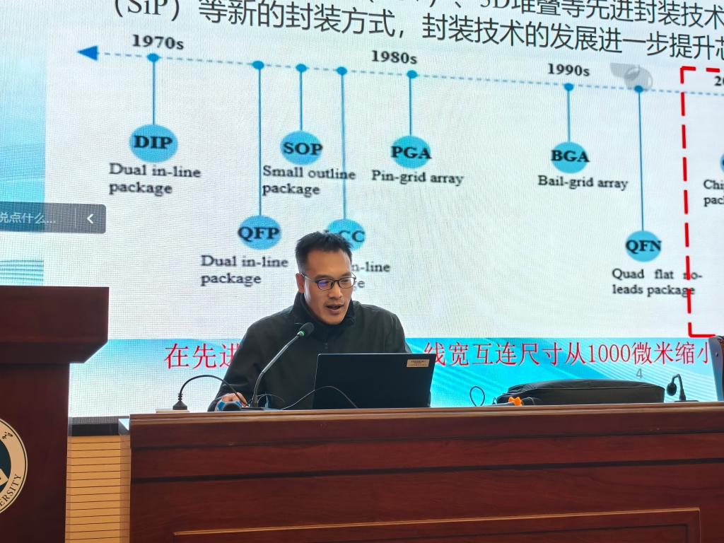 戴总监以《基于2.5D&3D集成应用的硅转接板制造技术》为主题展开,他首先从封装的作用与意义入手,深入浅出地介绍了封装的基本意义、发展历程与趋势、基本作用,他指出当今封装最主要的作用是系统集成与功能融合,当前先进封装技术已成为国际热点,具有很强的市场需求。接着,戴总监介绍了TSV(一种芯片内垂直互联技术)基本结构、优势特点及三种工艺路线,阐述TSV转接板设计要素、工艺流程及在TSV制造、RDL&bumping制造中运用的各项先进技术和实物案例,其后,戴总监通过分析TSV转接板的尺寸和集成趋势指出,从2D到3D存在技术障碍,2.5D作为过度技术,成为新的“热点”,他比较不同三维封装方案的优劣势,详细阐释2.5D/3D在大算力芯片封装和光电混合集成中的应用场景及案例。讲座结尾,戴总监提出目前3D集成技术面临的关键挑战,启发参会人员对相关领域进一步思考和探索。师生也积极与嘉宾交流探讨,开阔学术视野,锻炼科研思维,现场气氛热烈,师生受益良多。