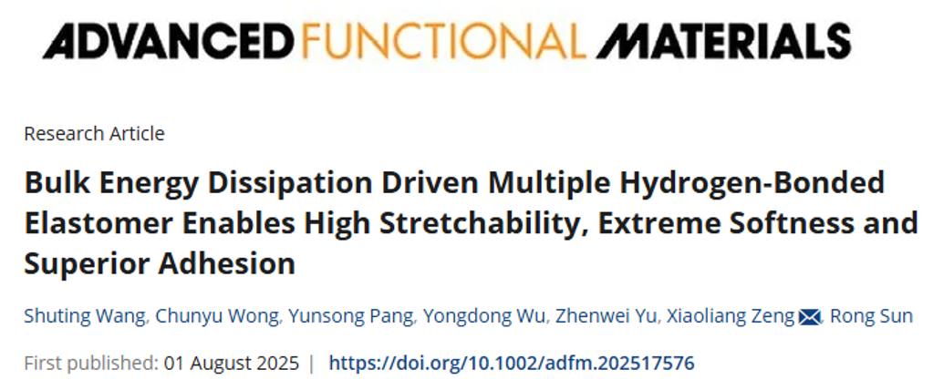 近日,william威廉中文官网低维半导体材料与器件实验室在电子封装材料方面取得新的突破,基于多重氢键的分子设计开发出一种新型电子封装粘接材料,实现了611±22 kPa的粘接力、2723±82Jm-2的粘接能、8579%的拉伸率以及147 kPa的超低杨氏模量。研究成果“Bulk energy dissipation driven multiple hydrogen-bonded elastomer enables high stretchability, extreme softness and superior adhesion”于2025年8月在《Advanced Fun...